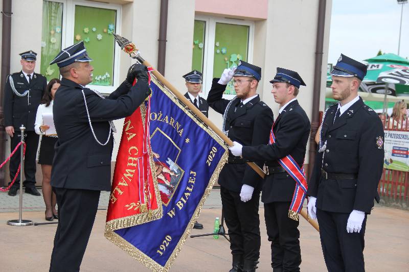 Następnie uroczyście pożegnano dotychczasowy sztandar OSP Biała, w skład delegacji weszli druhowie seniorzy, zasłużeni dla jednostki: dh Stefan Kolak, dh Marek Cichy, dh Eleonora Sak. Ceremonię poświęcenia oraz przekazania nowego sztandaru poprowadził ks. Łukasz Niepsuj. Kolejno dla całej miejscowości, jej społeczności, a przede wszystkim dla strażaków ochotników nadeszła uroczysta chwila nadania odznaczenia Ochotniczej Straży Pożarnej Złotego Znaku Związku, odczytanego przez wiceprezesa Zarządu Oddziału Wojewódzkiego ZOSP RP Województwa Małopolskiego dh. Andrzeja Jarochę. Delegacja Komitetu mieszkańców z Białej: Piotr Wadoń, Piotr Poręba, Zbigniew Poręba oraz Prezes OSP Biała uczestniczyli w ceremonii przekazania sztandaru ufundowanego przez mieszkańców oraz Grupę Azoty Tarnów, a następnie w jego dekoracji. Kolejnym ważnym punktem wydarzenia było odsłonięcie tablicy pamiątkowej OSP w Białej oraz poświęcenie i symboliczne przekazanie kluczyków do samochodu pożarniczego przez wójta Grzegorza Kozioła Prezesowi OSP Biała Krystianowi Lechowi.