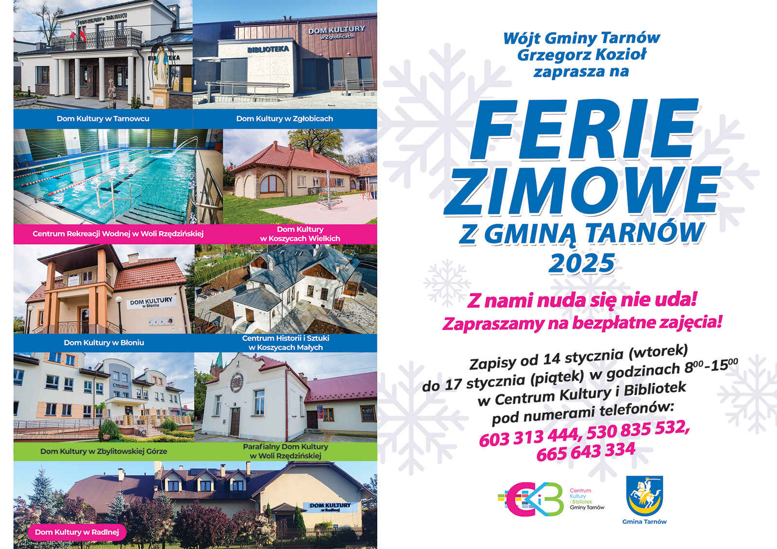 Wraz z początkiem ferii ruszają bezpłatne zajęcia i warsztaty we wszystkich Domach Kultury na terenie gminy Tarnów dla uczniów szkół podstawowych. Oferta zajęć jest naprawdę szeroka – są w niej propozycje zarówno dla miłośników zajęć artystycznych – warsztaty artystyczne oraz Szkoła pasteli, naukowych czy kreatywnych, jak i ciekawe spotkania m.in. ze strażakami – Strażak Sam czy dziennikarzami – Telewizyjne ABC i Dziennikarskie ABC. Uczestnicy zajęć będą mogli też brać udział w Akademii Foto, klubie szachowym, konkursach z książką, a także poznać zasady survivalu, historię broni i munduru w okresie międzywojennym czy dowiedzieć się nowinek technologicznych podczas zajęć z gadżetów przyszłości. W pierwszym tygodniu ferii w każdym domu kultury odbędzie także minikino. Ponadto Centrum Rekreacji Wodnej w Woli Rzędzińskiej w tym czasie jest bezpłatne dla uczniów i studentów mieszkających na terenie gminy Tarnów. Basen czynny będzie w godz. 9.00-21.00.