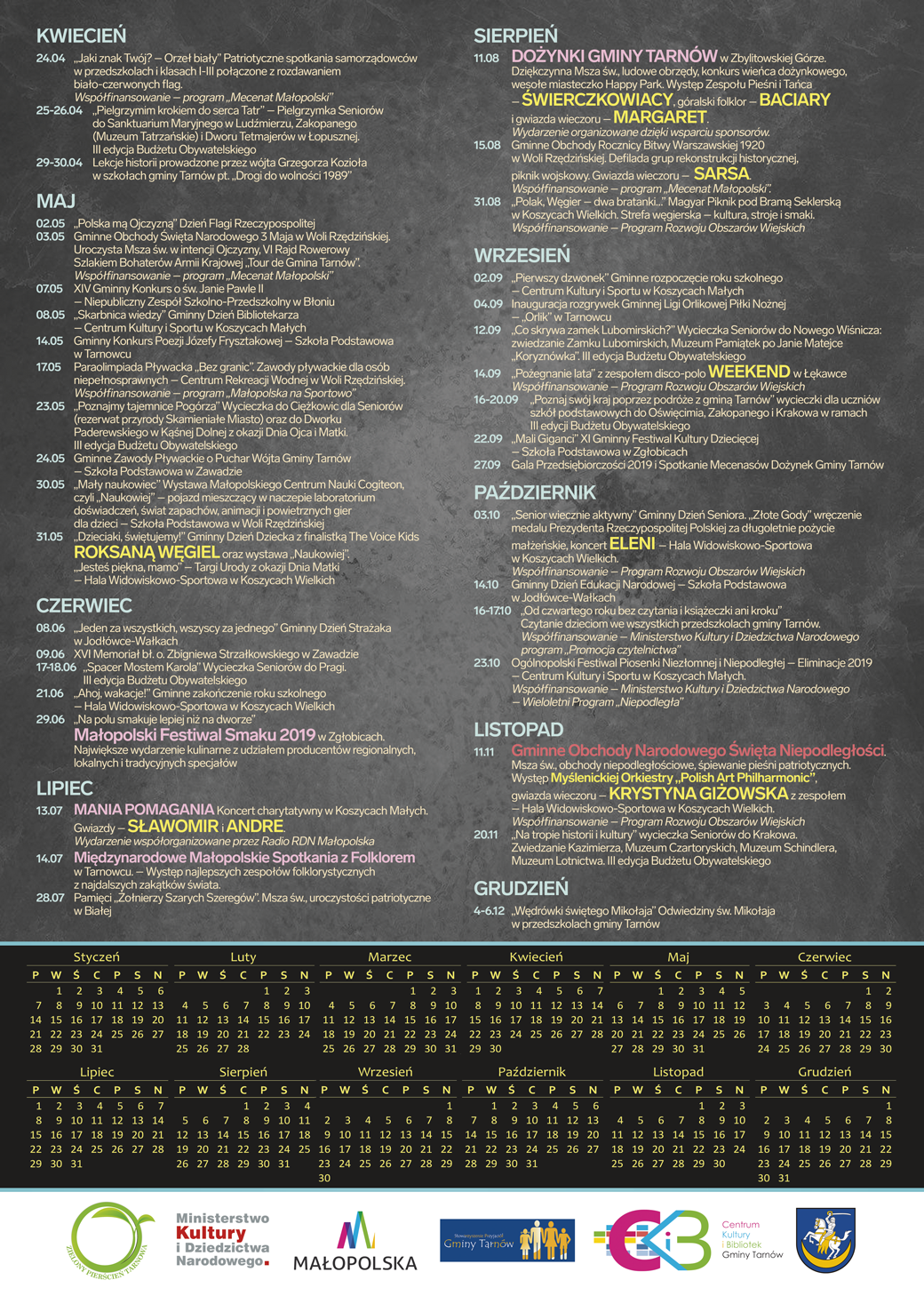 Warto dodać, iż organizowane wydarzenia, zwłaszcza tak dużego formatu, w większości odbędą się z pozyskanych środków w ramach realizowanych programów Urzędu Marszałkowskiego Województwa Małopolskiego, Ministerstwa Kultury i Dziedzictwa Narodowego, Zielonego Pierścienia, a także dzięki zaangażowaniu i wsparciu sponsorów. W obecnym wydaniu „Nowin” znajduje się kalendarz ze szczegółowym harmonogramem wszystkich przedsięwzięć, na które serdecznie zapraszamy mieszkańców gminy Tarnów.