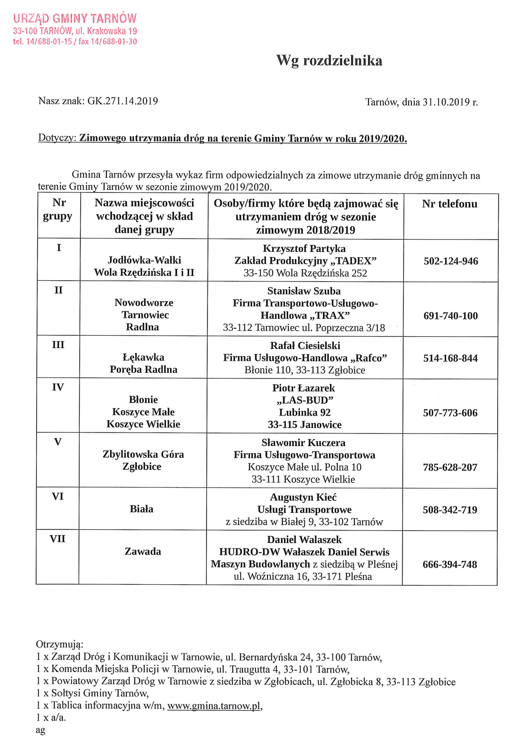 Równocześnie informujemy, że za zimowe utrzymanie dróg wojewódzkich odpowiada Zarząd Dróg Wojewódzkich w Krakowie Rejon Tarnów: telefon (14)621-98-46, natomiast za utrzymanie dróg powiatowych odpowiada Powiatowy Zarząd Dróg w Tarnowie z siedzibą w Zgłobicach, całodobowy telefon dyżurny: 501-799-432.