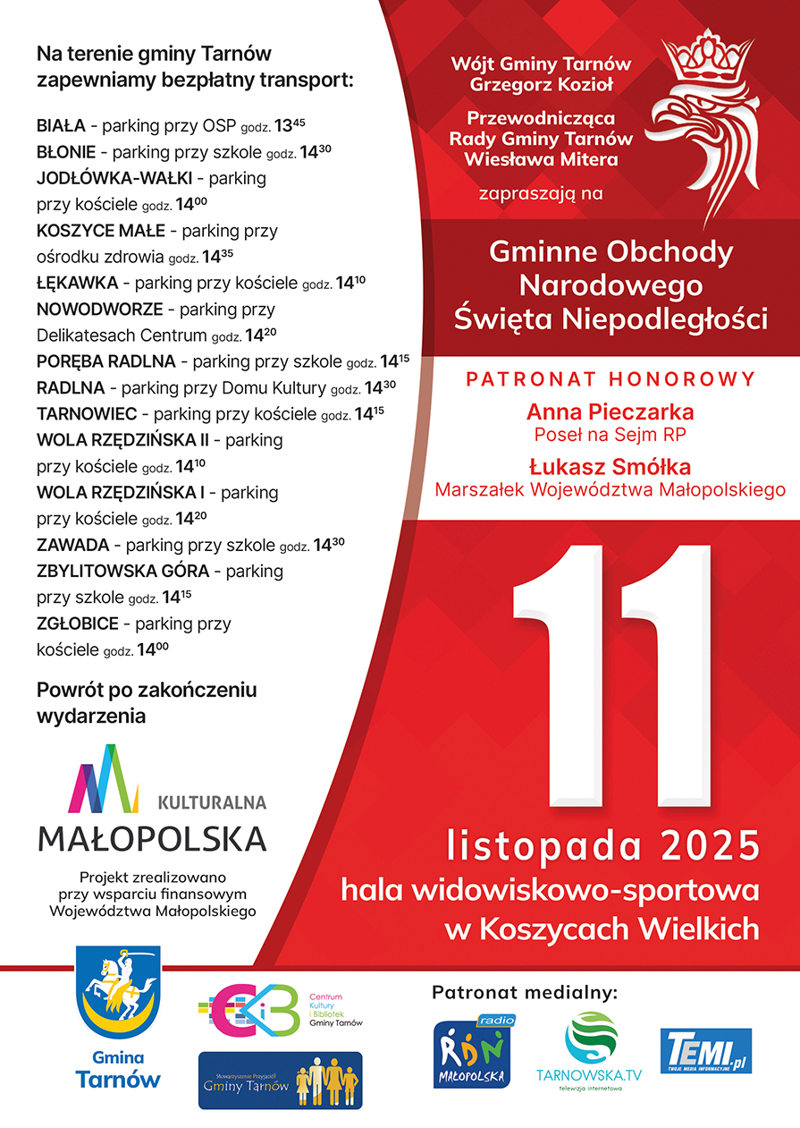 Na wydarzenie, które odbędzie się 11 listopada w hali widowiskowo – sportowej w Koszycach Wielkich, zapraszają wójt Grzegorz Kozioł wraz z przewodniczącą Rady Gminy Tarnów Wiesławą Miterą. Program jest bardzo bogaty i skomponowany w taki sposób, aby każdy znalazł w nim coś dla siebie. -Zapraszamy do wspólnego świętowania jednego z najważniejszych świąt patriotycznych w roku. Bądźmy dumni z wolności naszego kraju tak ciężko wywalczonej przez przodków – mówi wójt, Grzegorz Kozioł. Patronat honorowy sprawują: poseł RP Anna Pieczarka i marszałek Małopolski Łukasz Smółka.
