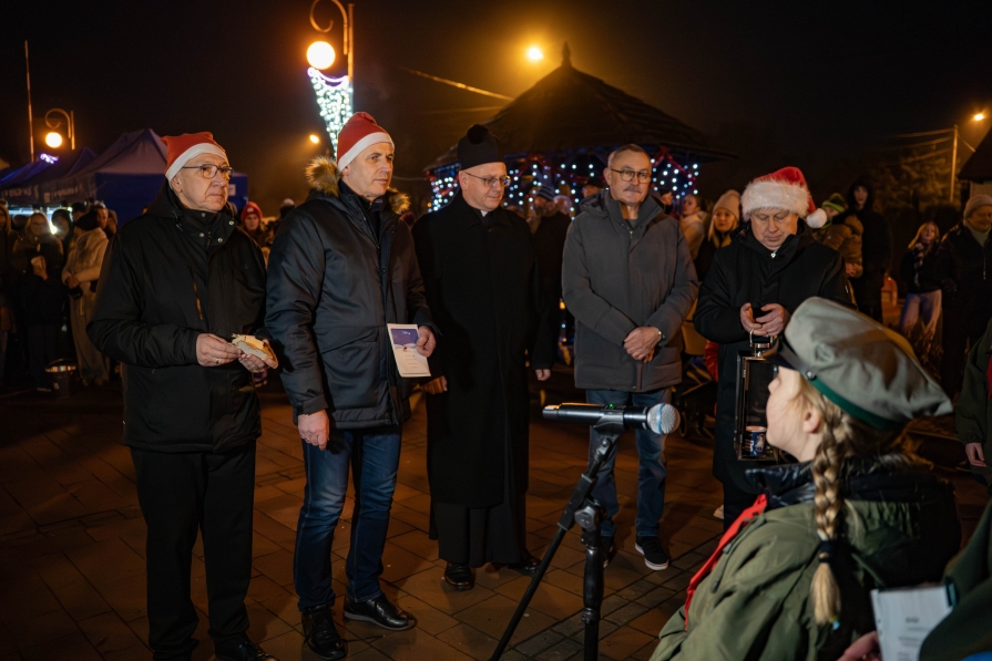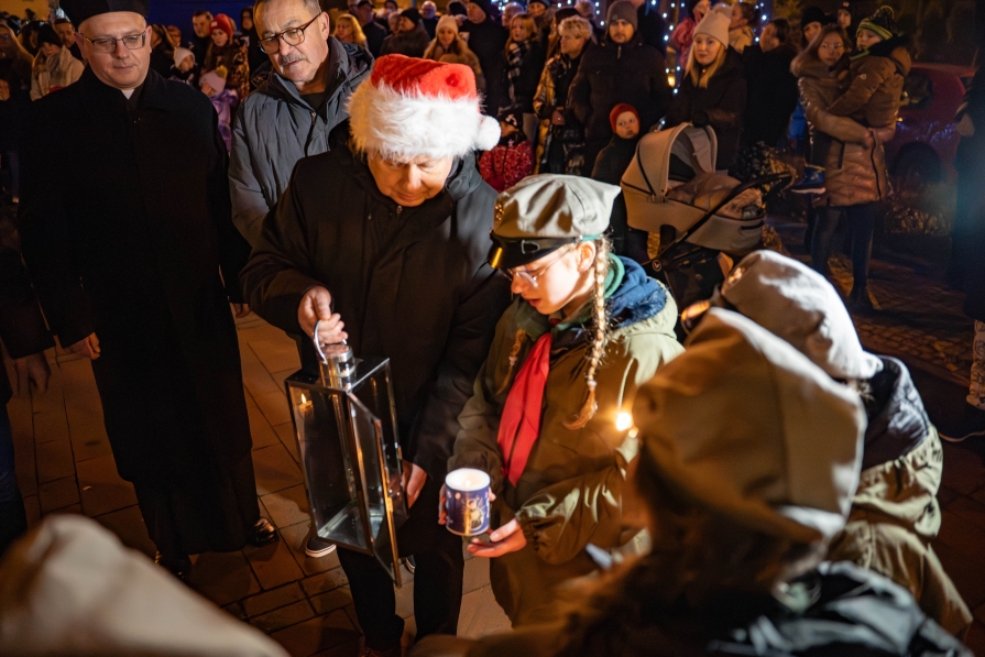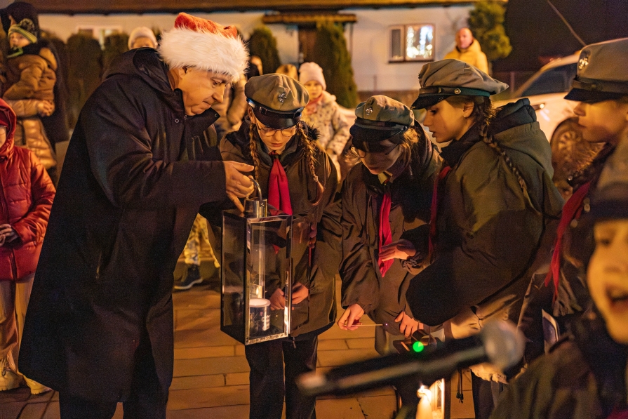 Betlejemskie Światło Pokoju, na ręce wójta Grzegorza Kozioła, któremu towarzyszyli zastępca Sławomir Wojtasik, wiceprzewodniczący Rady Gminy Tarnów Eugeniusz Wojtarowicz, sołtys Janusz Rymanowski i proboszcz miejscowej parafii ks. Paweł Płatek, przekazała Renata Kawula z 5. Tarnowskiej Drużyny Wielopoziomowej im. Janusza Korczaka w Żabnie wraz z młodymi harcerzami.