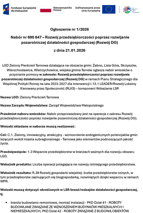 LGD Zielony Pierścień Tarnowa działająca na obszarze gmin: Żabno, Lisia Góra, Skrzyszów, Wierzchosławice, Wietrzychowice, wiejska gmina Tarnów ogłasza nabór wniosków o przyznanie pomocy finansowej w zakresie: Rozwój przedsiębiorczości poprzez rozwijanie pozarolniczej działalności gospodarczej. Na co konkretnie można zdobyć pieniądze?