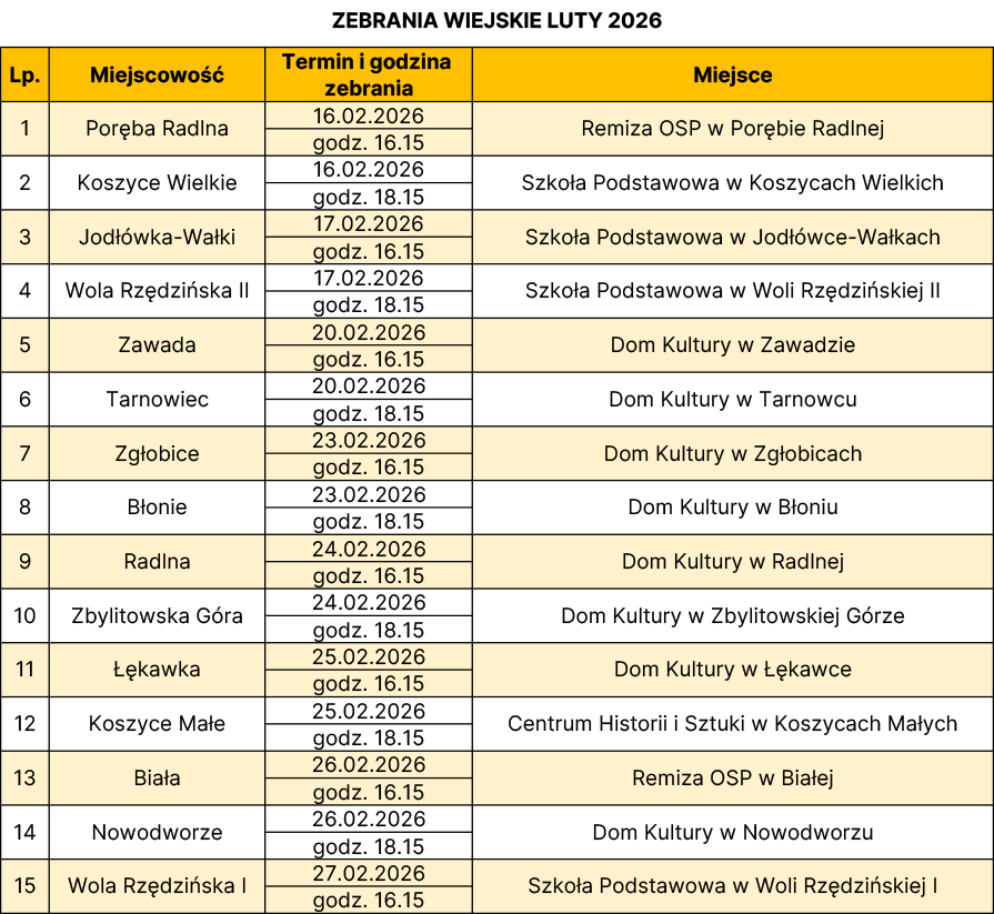Zebrania wiejskie odbędą się od 16 do 27 lutego, zgodnie z poniższym harmonogramem.
