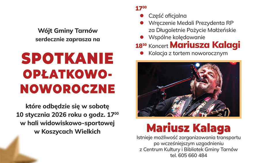 Już w najbliższą sobotę, 10 stycznia w hali widowiskowo-sportowej w Koszycach Wielkich odbędzie się spotkanie opłatkowo-noworoczne, na które zapraszamy seniorów oraz członków Kół Gospodyń Wiejskich z Białej, Błonia, Koszyc Wielkich, Koszyc Małych, Zbylitowskiej Góry i Zgłobic. Natomiast tydzień później, 17 stycznia, zapraszamy do sali sportowej przy Szkole Podstawowej nr 1 w Woli Rzędzińskiej mieszkańców Woli Rzędzińskiej I i II, Jodłówki-Wałek, Tarnowca, Nowodworza, Poręby Radlnej, Radlnej, Łękawki.