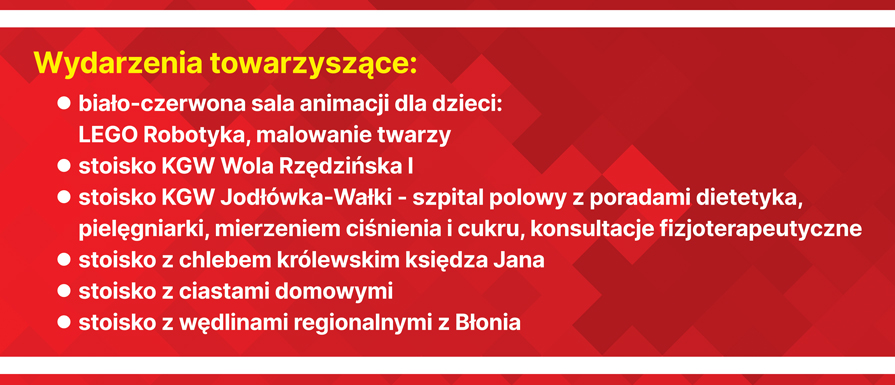 A zawsze pokolenia łączyły, tworząc poczucie przynależności do Ojczyzny, pieśni patriotyczne – dlatego ich wspólnego śpiewu nie zabraknie w Woli Rzędzińskiej. Na uczestników czekać będą również wyjątkowe atrakcje dodatkowe – poczęstunek bigosem i gulaszem dla wszystkich, sala z animacjami dla najmłodszych, porady medyczne, a nagrody może wygrać każdy, kto zakupi los w loterii. Zapraszać będą też stoiska z produktami regionalnymi i kół gospodyń.