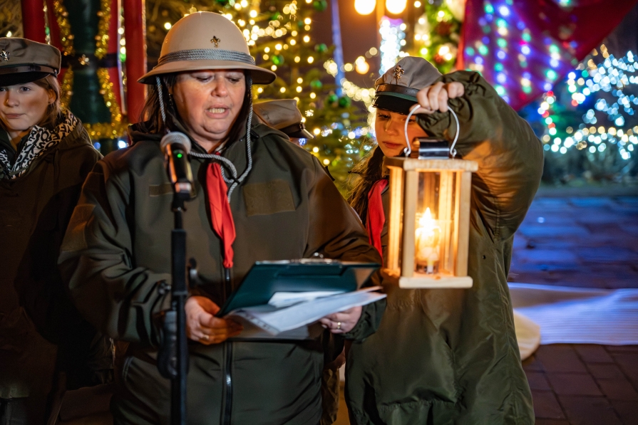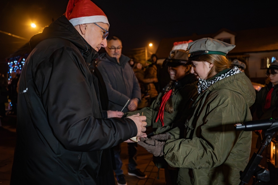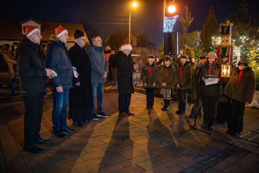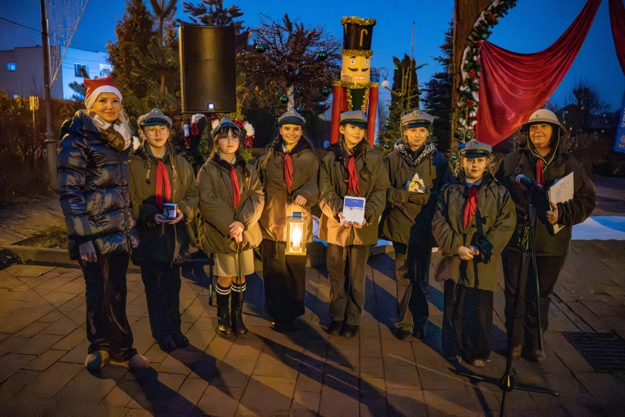 Betlejemskie Światło Pokoju, na ręce wójta Grzegorza Kozioła, któremu towarzyszyli zastępca Sławomir Wojtasik, wiceprzewodniczący Rady Gminy Tarnów Eugeniusz Wojtarowicz, sołtys Janusz Rymanowski i proboszcz miejscowej parafii ks. Paweł Płatek, przekazała Renata Kawula z 5. Tarnowskiej Drużyny Wielopoziomowej im. Janusza Korczaka w Żabnie wraz z młodymi harcerzami.