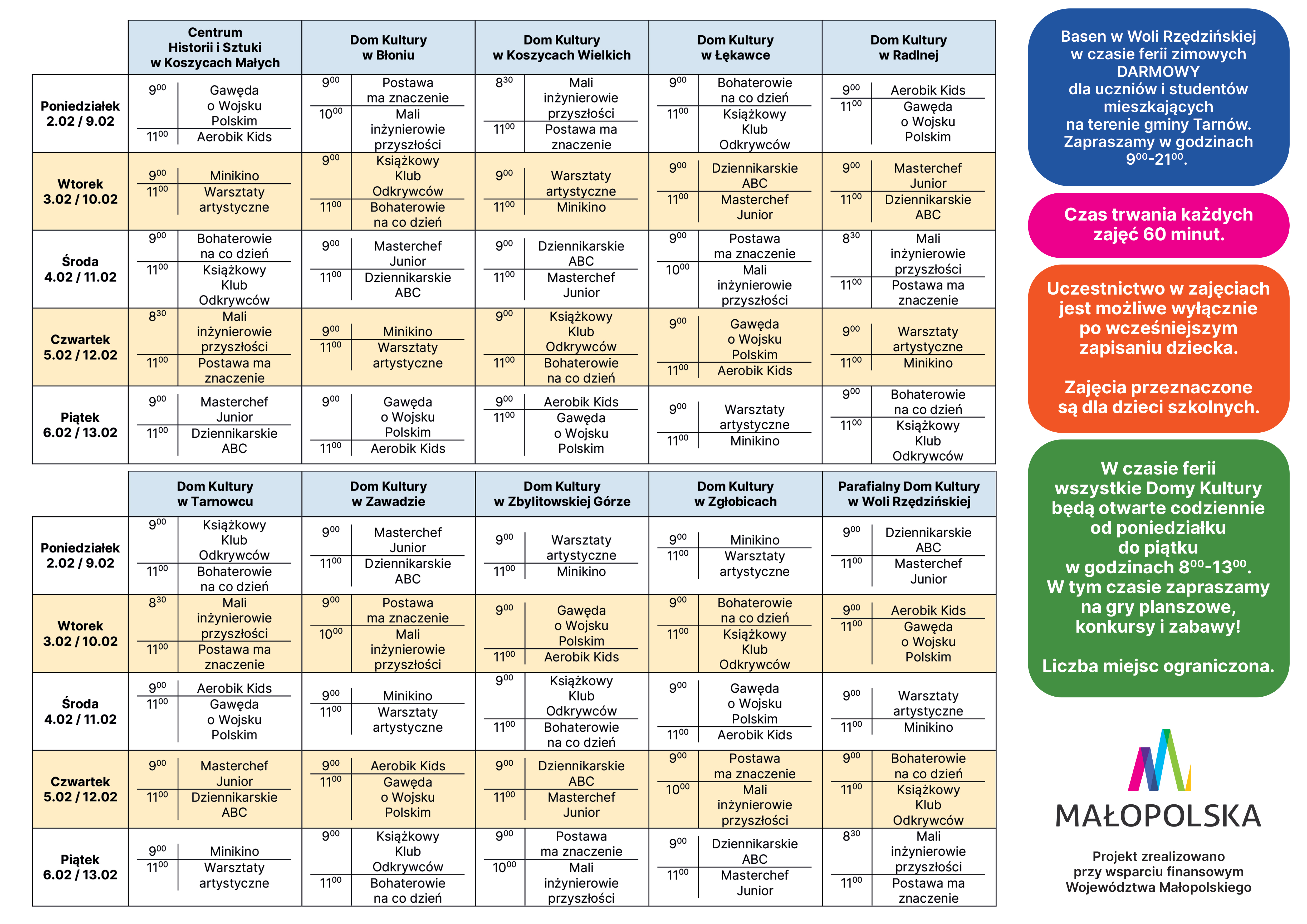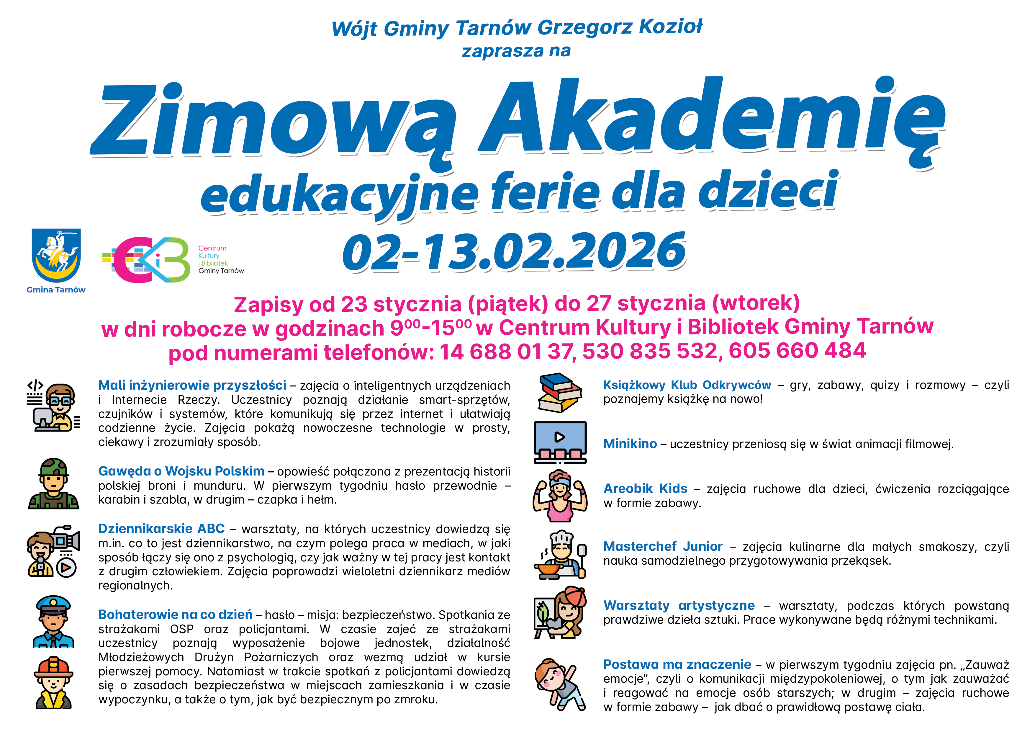 Wraz z początkiem zimowej przerwy w nauce ruszają bezpłatne zajęcia i warsztaty we wszystkich Domach Kultury na terenie gminy Tarnów. To propozycja dla uczniów szkół podstawowych. Oferta zajęć jest bardzo bogata - są w niej propozycje zarówno dla miłośników spotkań artystycznych, naukowych, kulinarnych czy sportowych. Zapisy ruszają już w piątek, 23 stycznia, i potrwają do wtorku, 27 stycznia, w godzinach 8.00-15.00 pod nr tel. 603 313 444, 530 835 532 lub 665 643 334.