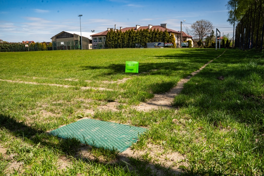 instalacja nawodnienia płyty boiska za pomocą 24 zraszaczy rotacyjnych.